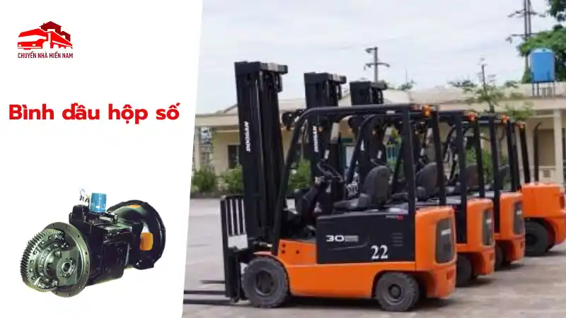 - Vai trò: Chứa dầu bôi trơn và làm mát cho các bánh răng, vòng bi trong hộp số (thường là hộp số tự động trên xe nâng động cơ đốt trong). Một số xe nâng điện đơn giản hoặc xe nâng tay không có hộp số riêng biệt cần dầu bôi trơn.