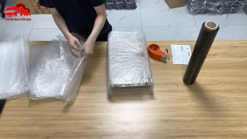 - Quấn màng PE: Nếu có, hãy quấn thêm một vài lớp màng PE (stretch film) bên ngoài lớp xốp hơi. Màng PE giúp cố định lớp xốp tốt hơn, tăng khả năng chống bụi và ẩm nhẹ.